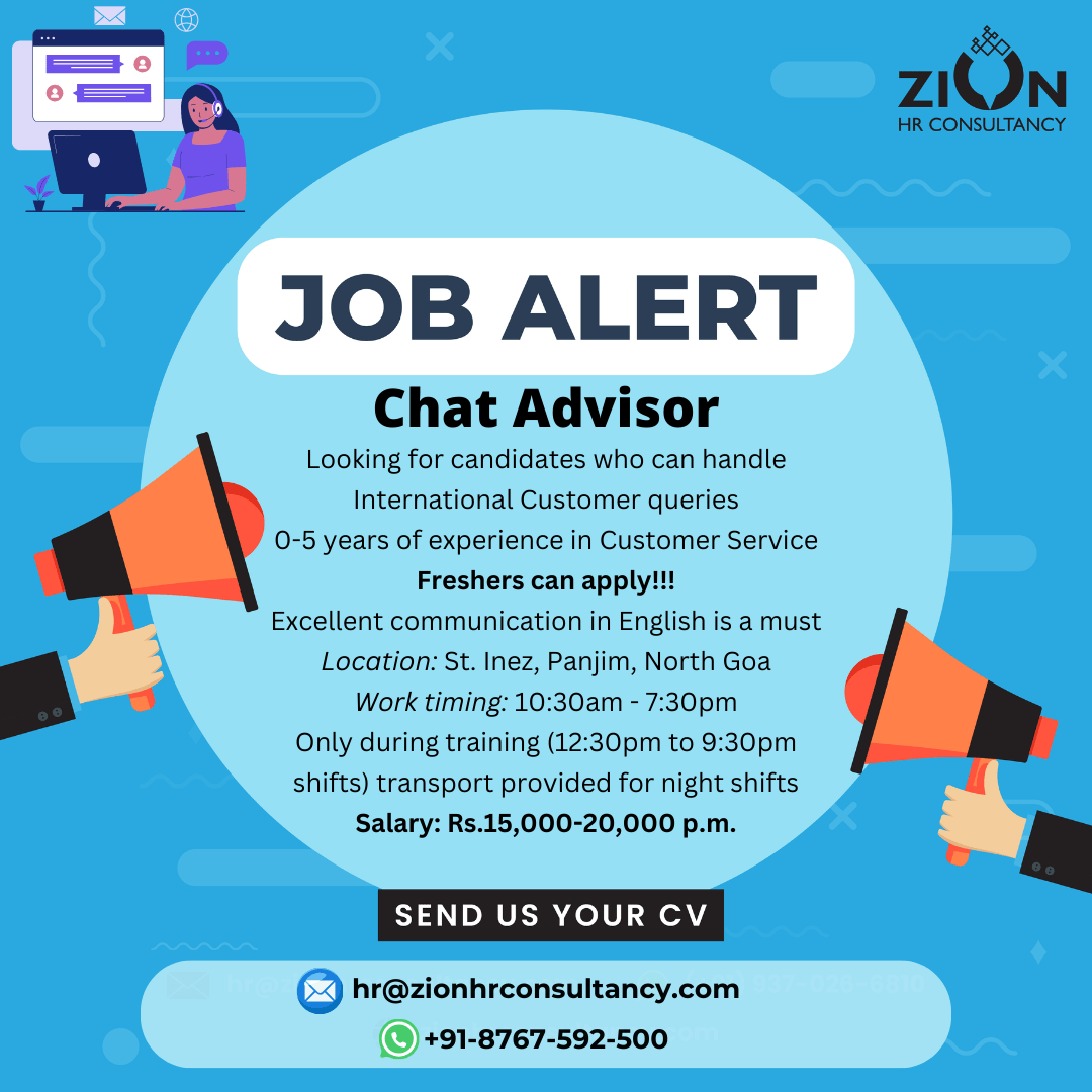 Location: St. Inez, Panjim, North Goa Summary: The Hiring Company is looking for candidates to work for International Tour Operators and Airline in Back Office Operations, the candidates will be handling International Customer queries. Qualifications: Salary: Upto INR 22,000 per month Working hours: 10:30am – 7:30pm. Only during training (12:30pm to 9:30pm shifts) transport providedContinue reading “Chat Advisor”